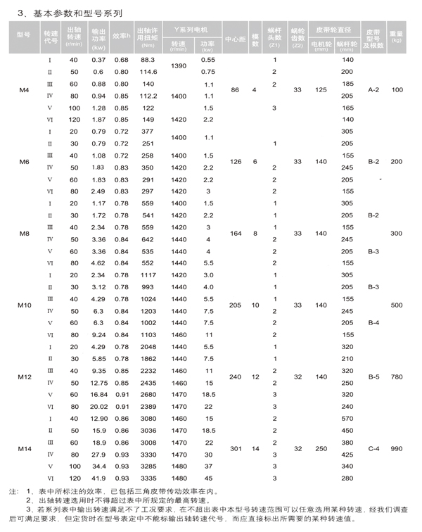 1.3选择减速机型号时,要根据输出轴转速与输出功率这两个参数在表3-1中选择型号。